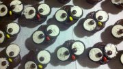 I used store-bought cake mix and icing and baked per the directions for cupcakes. After they cooled, I iced them with chocolate frosting. Divide the Oreos in half and discard the side with no frosting (I actually saved mine for pie crusts or other treats needing cookie crumbs!) and then place the Oreos on top of the cupcake. before you put your brown Reese’s pieces on your Oreo to make the eye, dab a little bit of frosting on it first to act as glue. I used either yellow or an orange Reese’s for the beak and placed it sideways in between the eyes. For the finishing touch I added some texture to the top of the head for feathers. But, I also got lazy and only ended up doing this on half… it really didn’t matter either way!