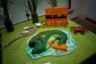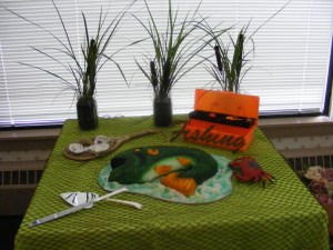 To decorate I started with the use of the wedding color by using a lime green tablecloth and covered it with a crab/fishing net over top. My mother in law had an antique tackle box and a tin fishing sign, we also put a few oyster shells out and a little handheld net. To finish it off I put live plants in mason jars and added some cattails. Looked great! My husband loved it. 🙂