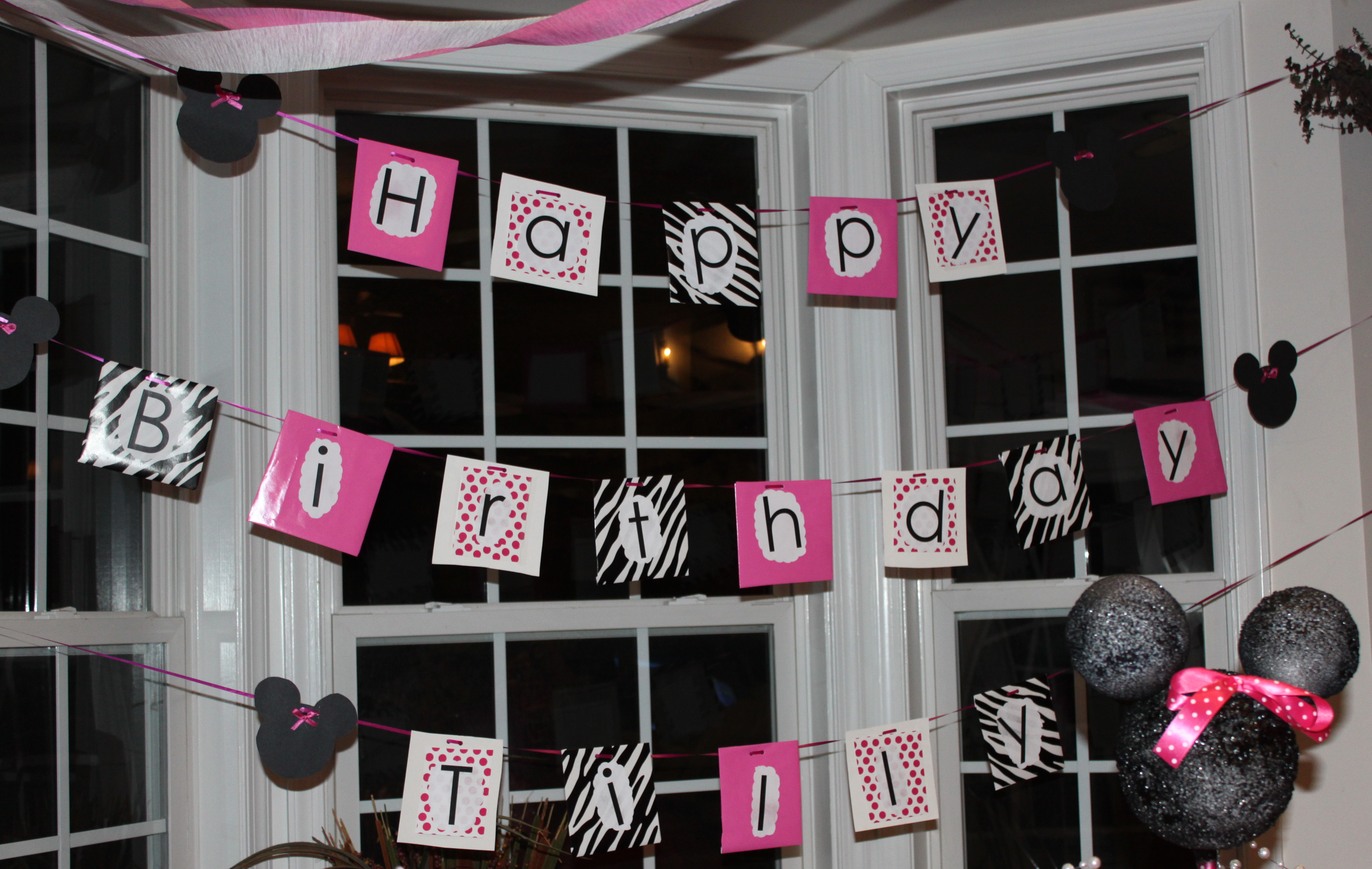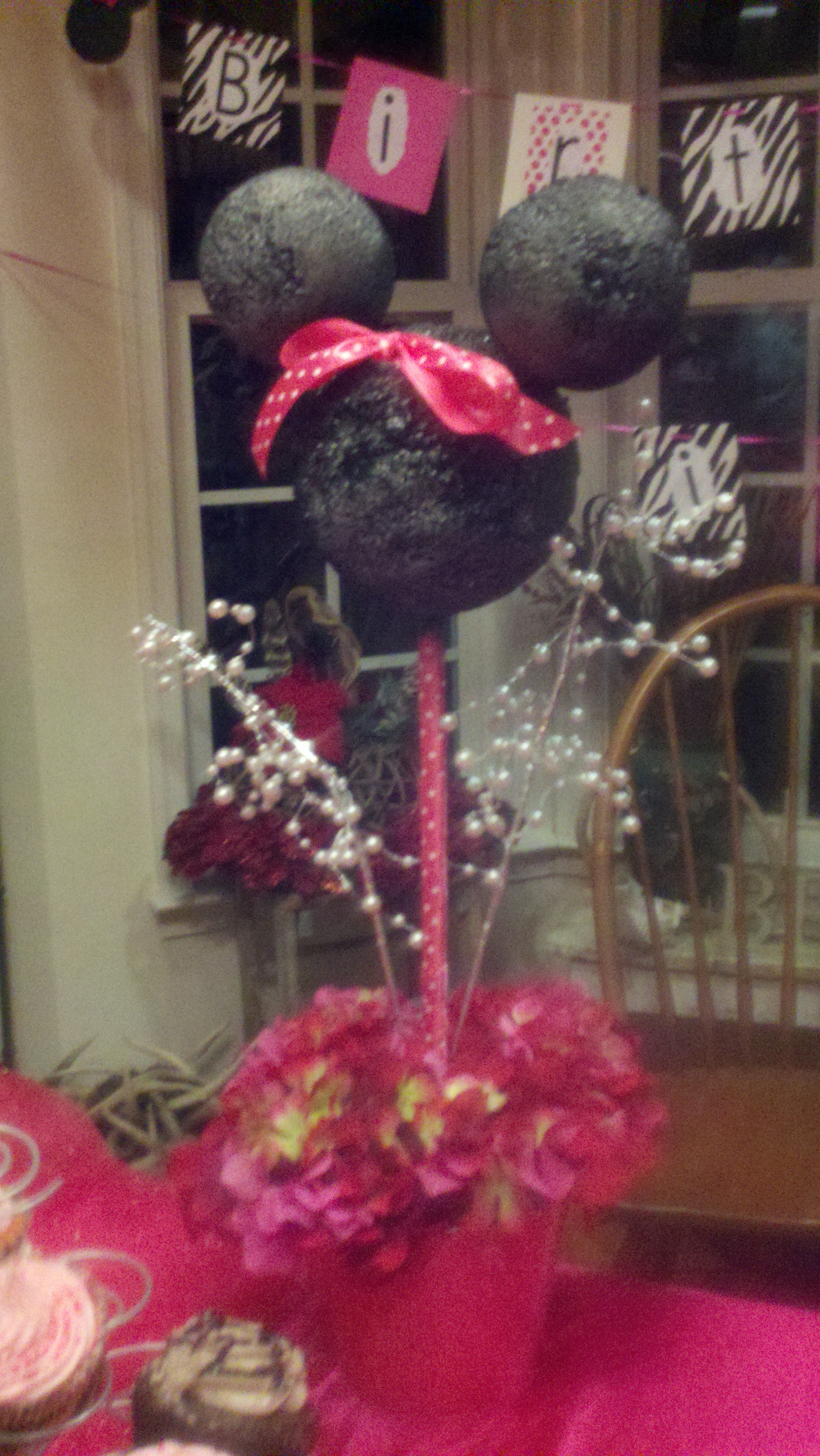 To create the centerpiece, I spray painted 3 foam balls black and secured them with hot glue & wooden dowels in a hot pink bucket. Flowers & spray pearls were used in the base to hide the foam and hot pink and white polka dot ribbon was wrapped around the dowel and also used to make a bow for Minnie.