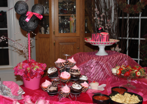 Shiny, shear pink fabric was laid overtop of a white table cloth. Boxes wrapped with zebra wrapping paper were placed under the tablecloth to create height for the serving dishes. I decorated the table with candle cupcakes, Mickey Mouse serving dishes, flowers and tissue paper poms.