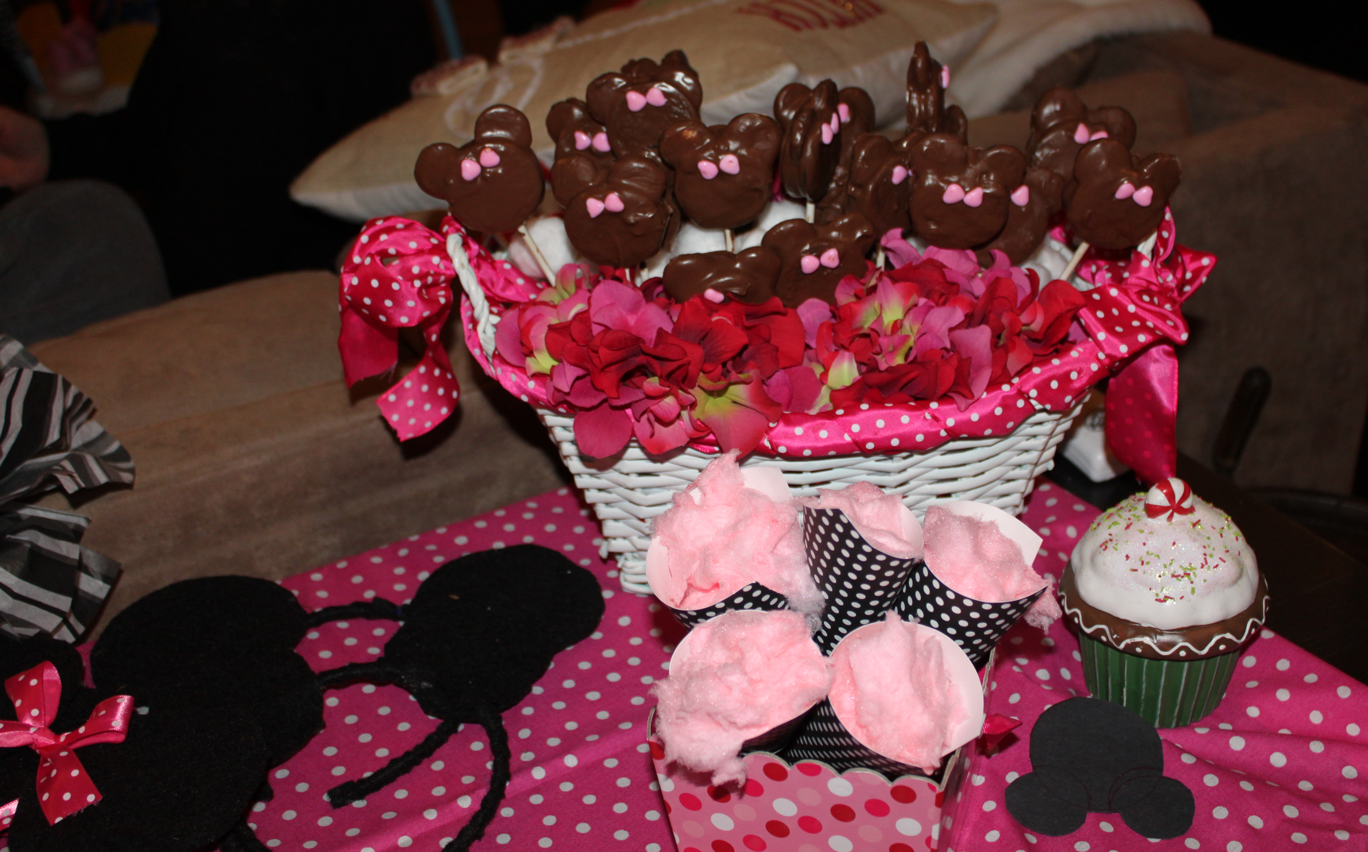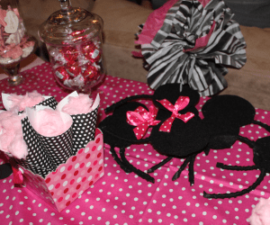 The favor table held yummy treats for the party guests to take home. My favorite was the chocolate covered Minnie Oreo pops. I used regular and mini Oreos to create a mouse head, inserted a stick and dipped in chocolate. The pink bows were created with heart-shaped sprinkles. We also served cotton candy in black and white polka dot cones. These were super quick to make by folding cardstock into a cone shape and hot gluing it together. So easy and such a cute way to serve treats! 🙂