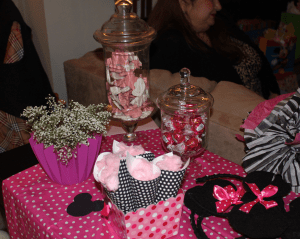 To cover the table I used a hot pink and white polka dot table cloth and placed some Mickey Mouse head silhouettes on the table. There was an extra tissue paper pom that ended up on the table as well as fresh flowers and apocothary jars filled with pink frosted animal crackers and pink wrapped truffles.