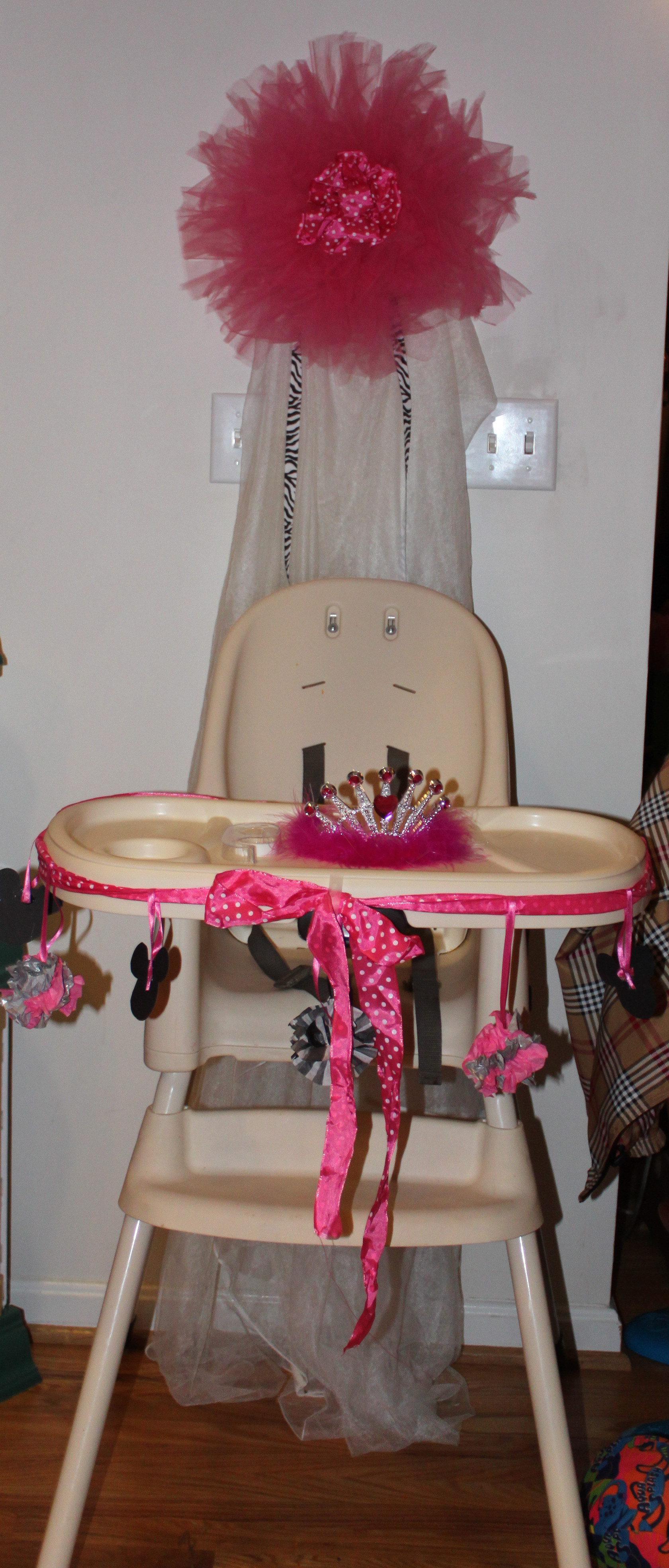 For the Birthday’s girl’s high chair, I tied little tissue paper pom poms and Minnie Mouse silhouettes on a ribbon and tied it around the high chair tray. The backdrop is a piece of white netting with a tulle & ribbon bow holding in the center. A special seat just for the birthday princess!