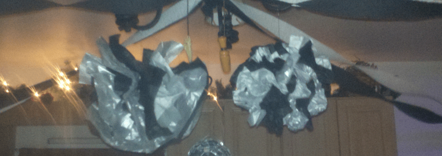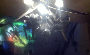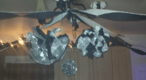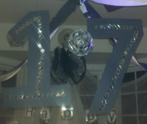 I cut about 25 pairs of “17” numbers out and hung them from the ceiling and hung them on the walls all over place. I cut two larger sets and hung them from the center of each room and glued mirror tiles on the numbers. I also made disco balls with mirror tiles, hot glue and styrofoam balls. The numbers and the mirror tiles looked really cool when it was dark and all the special lights were bouncing off of them!
