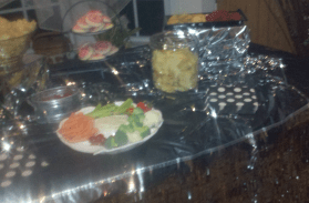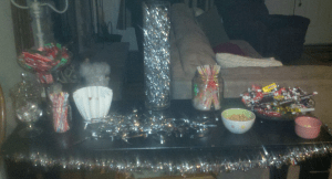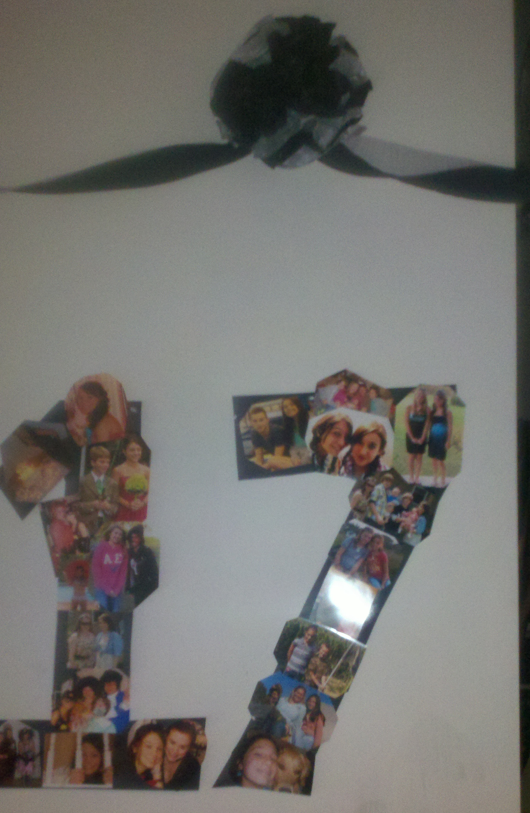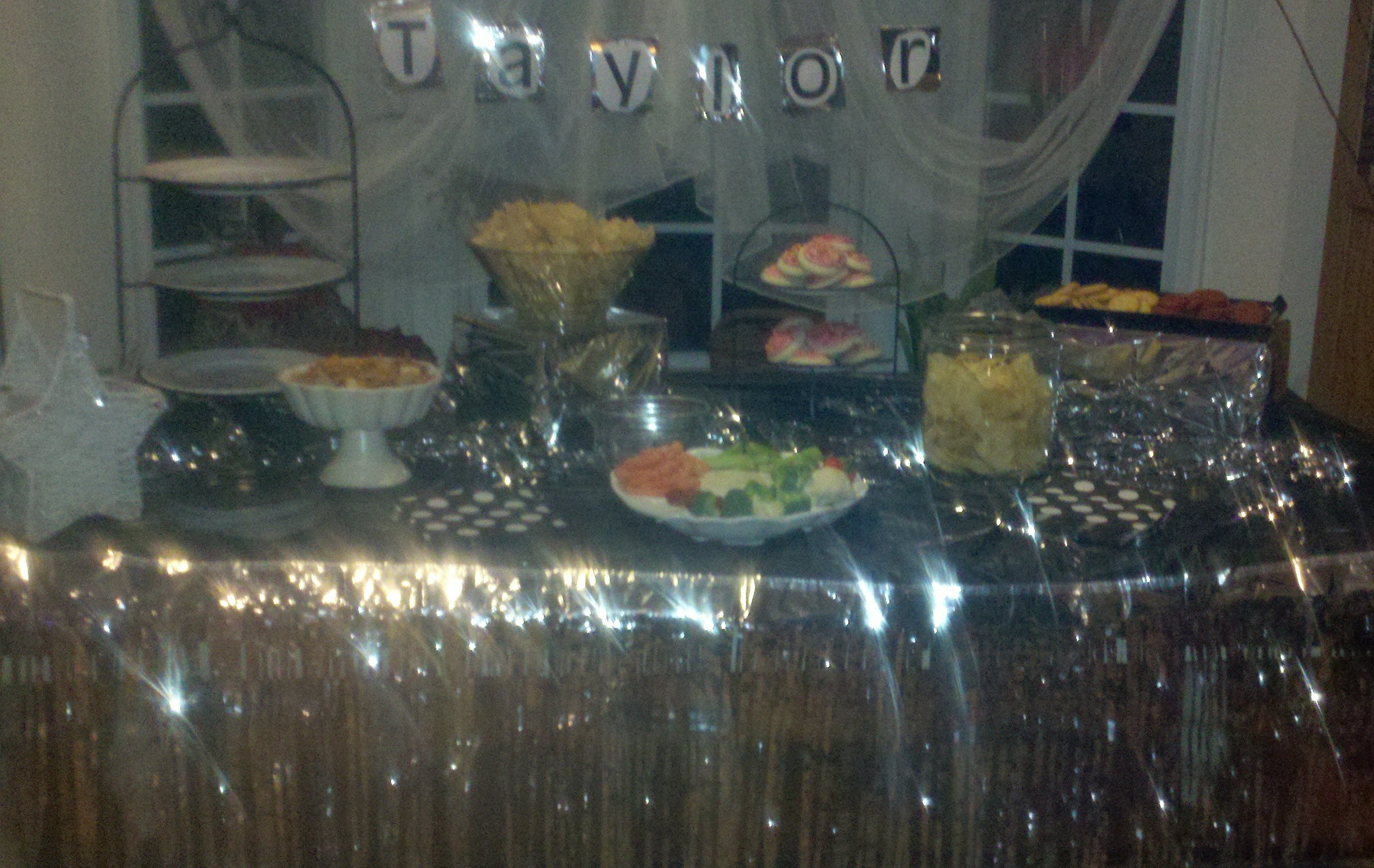 The food table was decorated with a black table-cloth with a sparkly silver tinsel garland tied around the table. We had pigs in a blanket, pizza rolls, veggies, cookies, chips, cheese sticks, meatballs and cheese, crackers & pepperoni slices. For her cake I made a sheet cake and cut it out in the shape of a “17”, We decorated it with black and silver icing. The cake was an epic fail, so there are no pictures of that! It was yummy, but not eye pleasing! 🙂