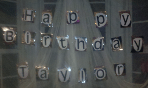 The banner was made with black construction paper and silver wrapping paper. Happy Birthday, Taylor!