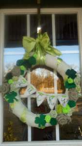 The days are getting longer and the weather a little warmer, spring is coming! I was a tad dissapointed that we didn’t get a good snowman-building snow this year, but I’m over it and now am ready for the spring blooms and beautiful weather! I have seen so many cute ideas out there in blogland for St.Patrick’s day and decided that this year I would celebrate my Irish side and have some fun with some St.Patty’s day crafts! It was time to dress my door and change from the Valentines Day Wreath. I decided to do a bright, cheery St. Patrick’s Day wreath.