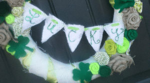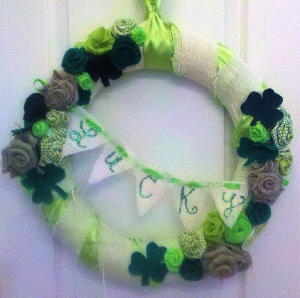 The wreath is wrapped in lime green satin fabric and overlaped with burlap strips. Various colors of shamrocks were glued on as well as flowers made of fabric scraps, burlap & felt.