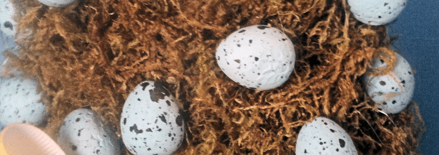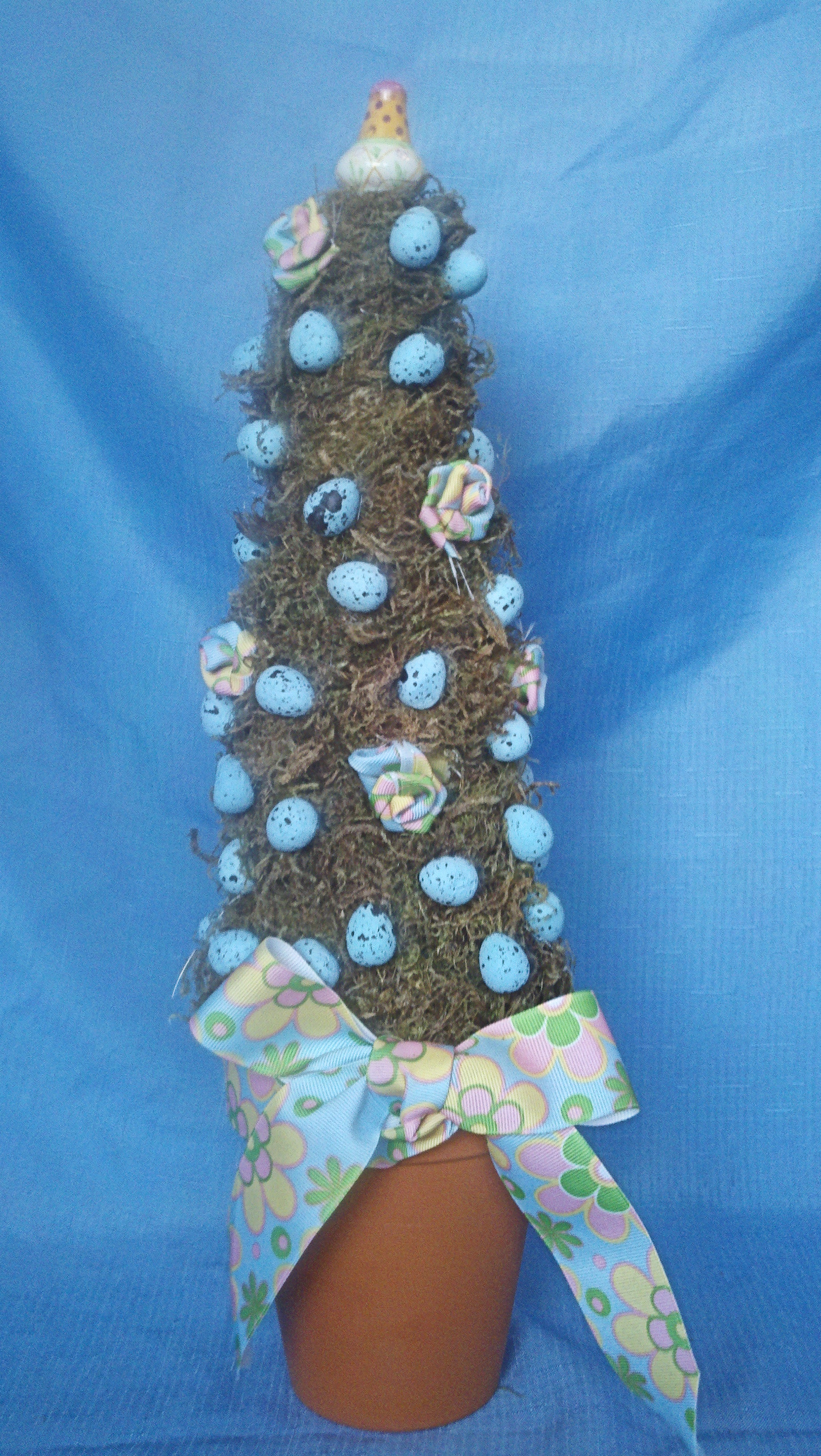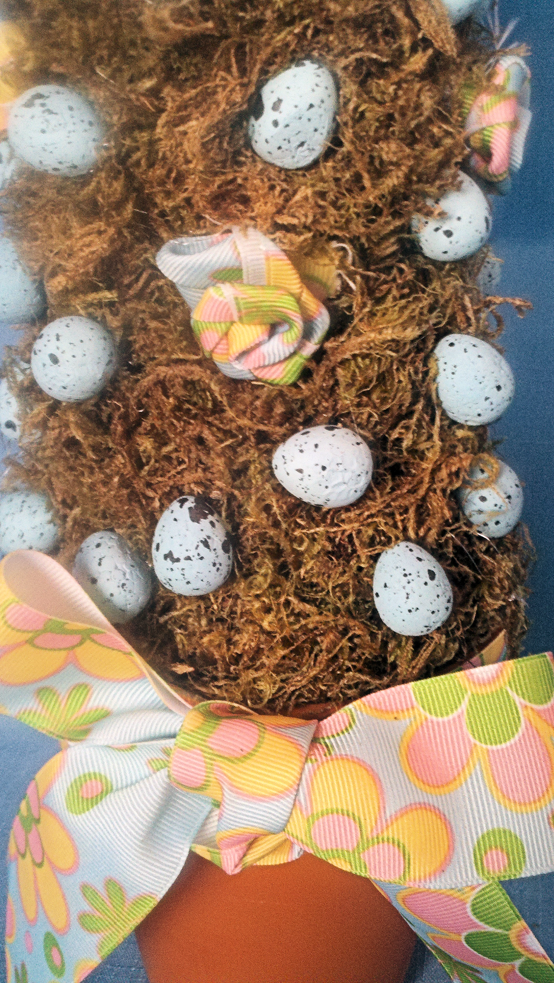 Styrofoam, flower pot, hot glue, eggs, ribbon, finial & moss