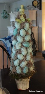 After the entire cone was covered in moss, then it was time to glue on the mini Robin’s eggs. I got the eggs from the craft store, I think they were just $1 for about 20 of them. Basically I just hot glued the eggs all over the topiary.