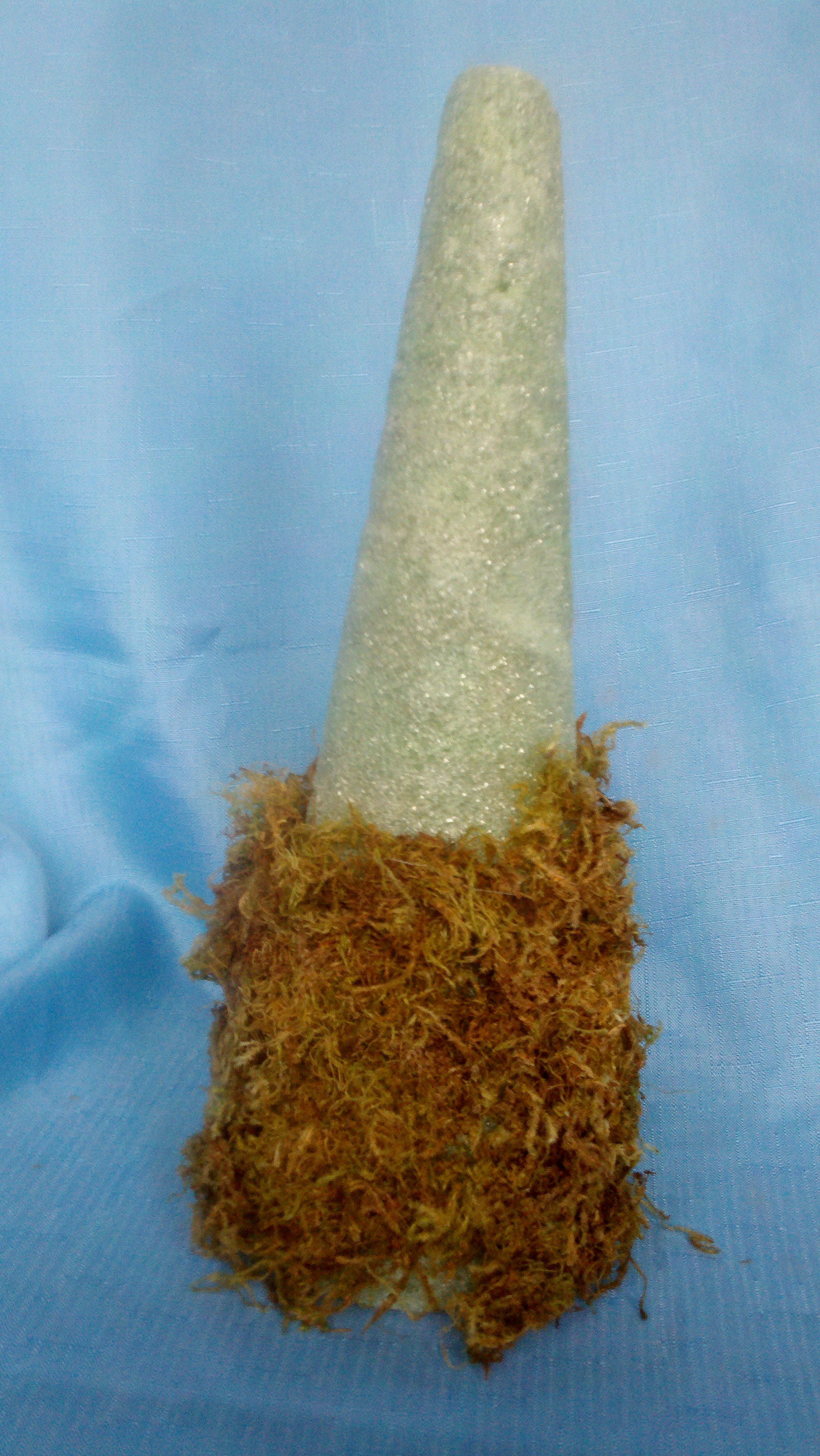 First I glued the foam cone into the flower pot, then I hot glued the moss all over the cone.