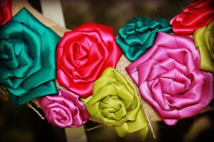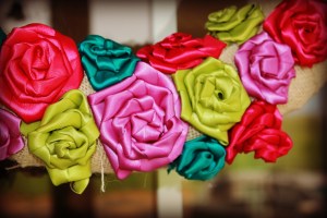 I cut my burlap into strips and wrapped it around the wreath and secured with glue.  Then I rolled up a bunch of rosettes made out of this gorgeous satin ribbon I found at the store.