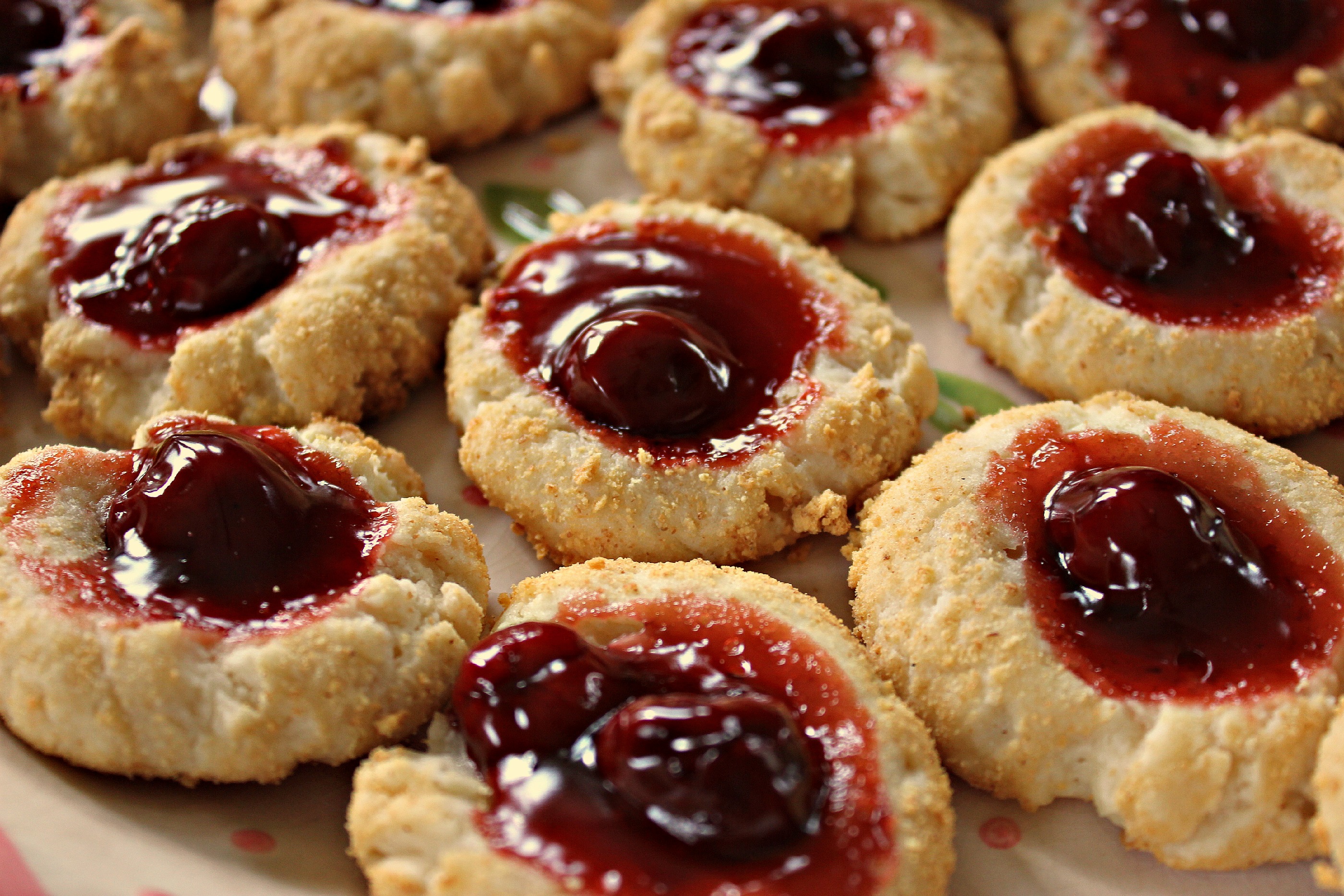 These cookies are super moist and chewy and really taste just like a bite of cherry cheesecake. The dough is made with cream cheese and them rolled in graham crackers. Just top it off with your choice of fruit filling and oh my-my… a perfect bite of cherry cheesecake every time. Genius!