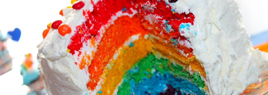 And there you have it. Such a bright, fun and cute cake! I decorated mine with skittles. I had visions of a pom pom banner across the cake, but time was not on my side that day. Once you cut into the cake, all them”oohs and ahhs” will take over and no one is paying attention to the outside anyways!