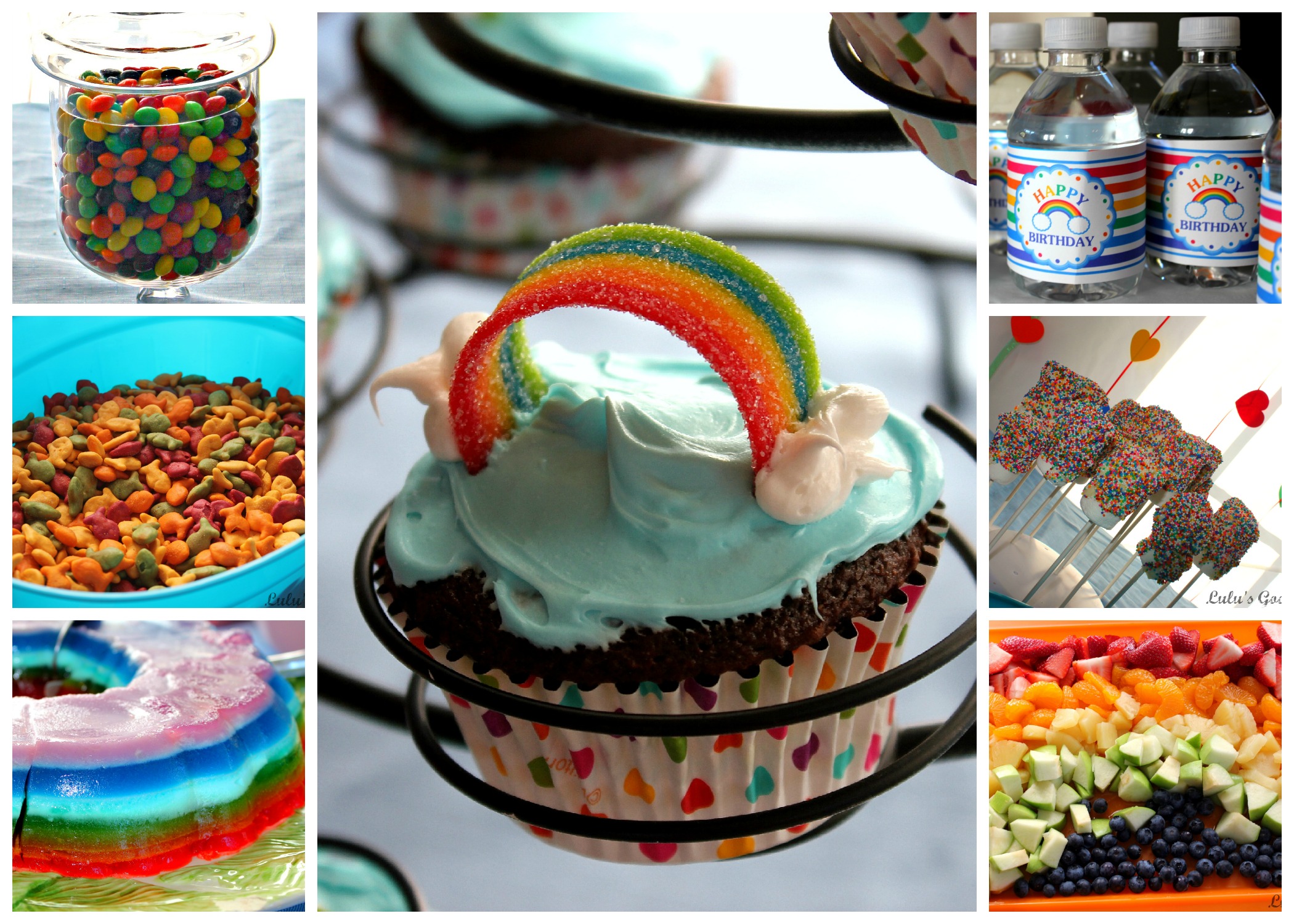 We served a colorful assortment of yummy goodies. There was rainbow chocolate cupcakes, marshmallow pops dipped in white chocolate with rainbow sprinkles, a rainbow jello mold, rainbow jello cookies, rainbow goldfish, lots of candy (skittles, twizzlers & M&Ms in apocothary jars) a rainbow fruit spread and their choice of PB&J or ham & cheese sandwich. I found the printables for the water bottles here at Printabelle.