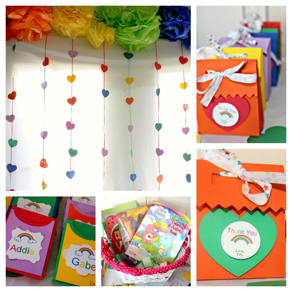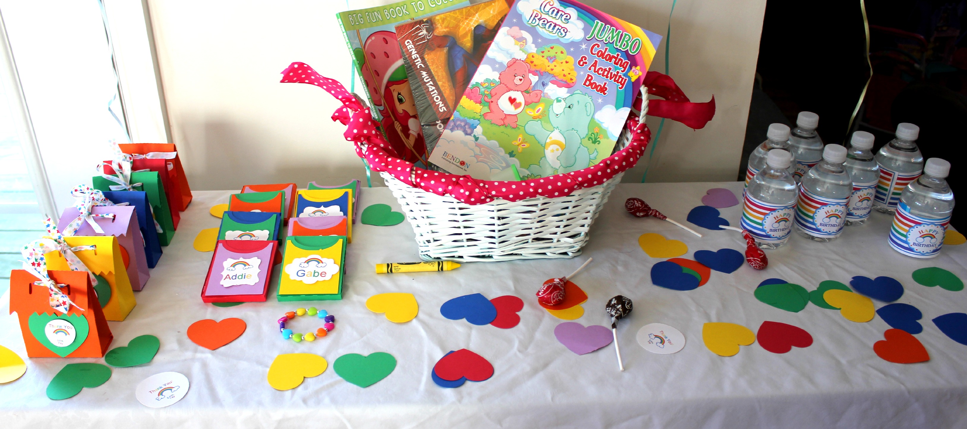 For the backdrop on my party table I hung a white table-cloth and cut out hearts with my Silhouette Cameo and taped them on ribbon for streamers underneath tissue paper pom poms. So cute! There were some left over heart cuts, so I scattered them around the food and favor tables. For the favors, I made little boxes out of cardstock and filled with M&Ms. I created a little Thank You tag and tied it all shut with a rainbow star ribbon. I let each kid pick out their own coloring book and play doh from a basket to go along with their own personalized box of crayons.
