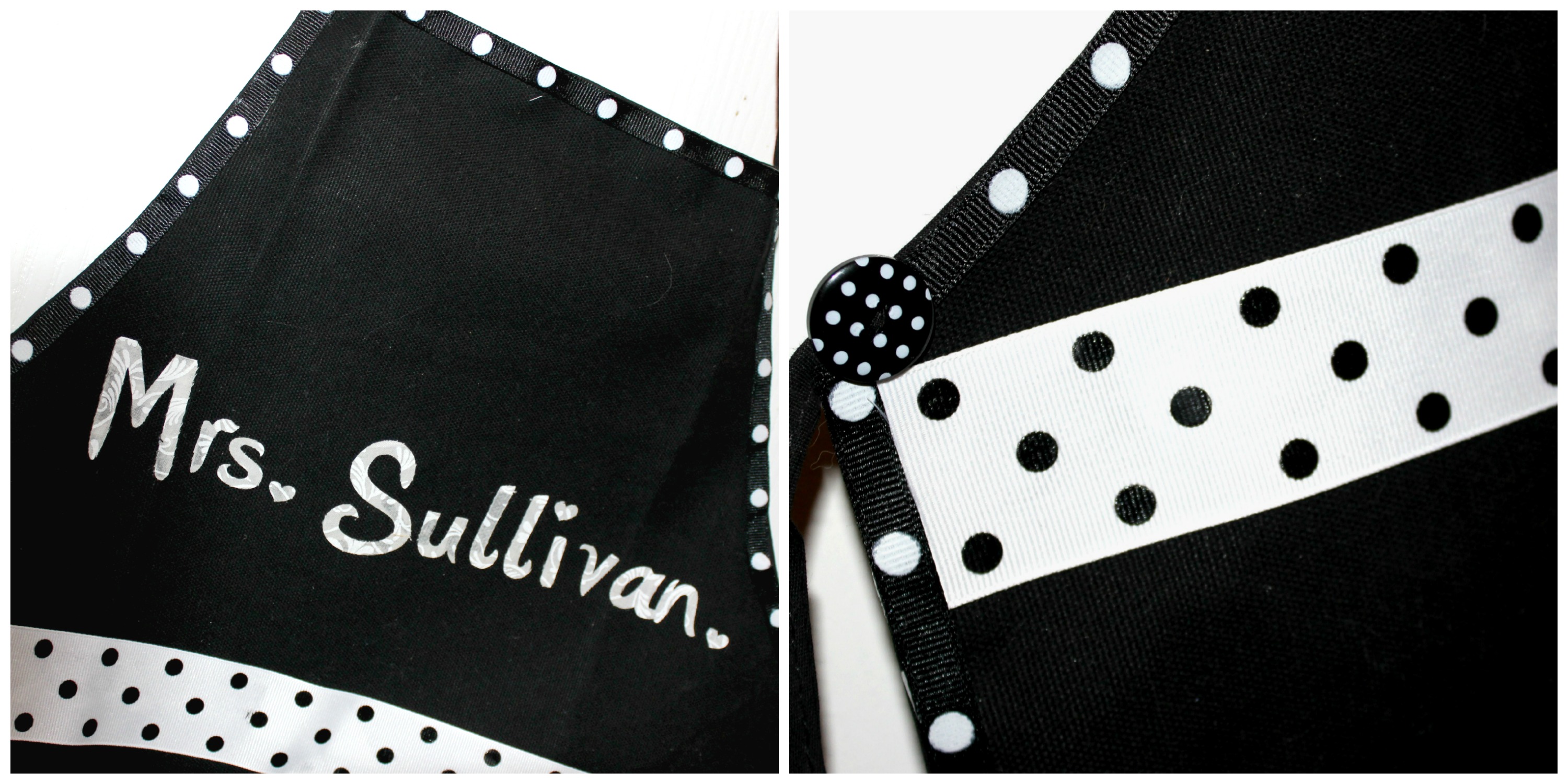 The apron’s personalized lettering was done pretty much the same way as the towels: bonded, cut and ironed on.  The ribbon was sewed on around the edge of the apron as well as some buttons to cover the seams. Little more work involved, but so cute! I remember when I was engaged, my friend gave me an apron that said “Future Mrs. Hitch” I thought I was hot stuff when I sported that around. I still wear it around sometimes, it makes me smile 🙂