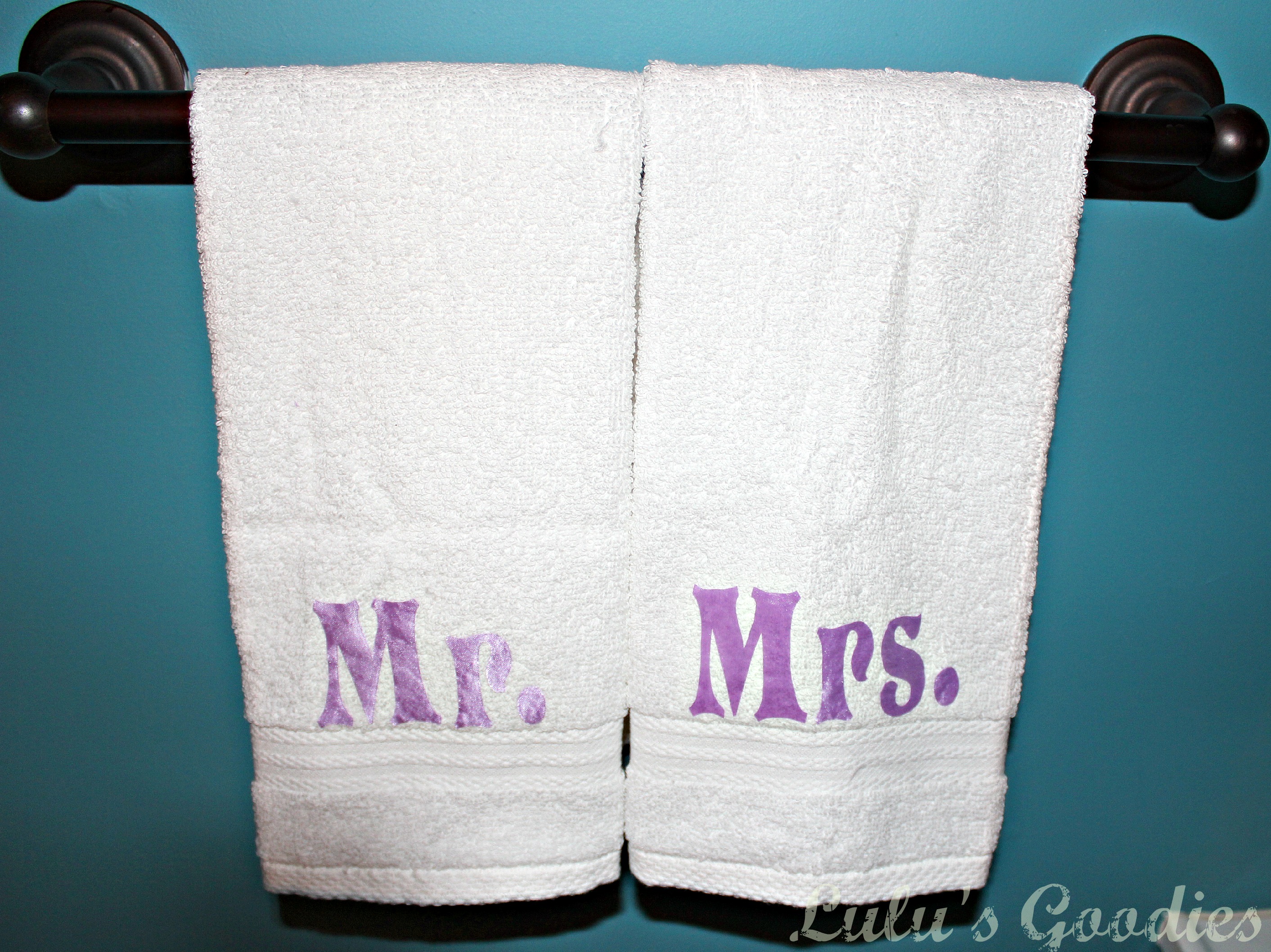 The hand towels were super easy to make. We ironed on some bonding paper to the purple fabric (her wedding colors), cut the letters out on the Cameo and the ironed them onto the towels.  How fun and cute is that for an excited newlywed?!