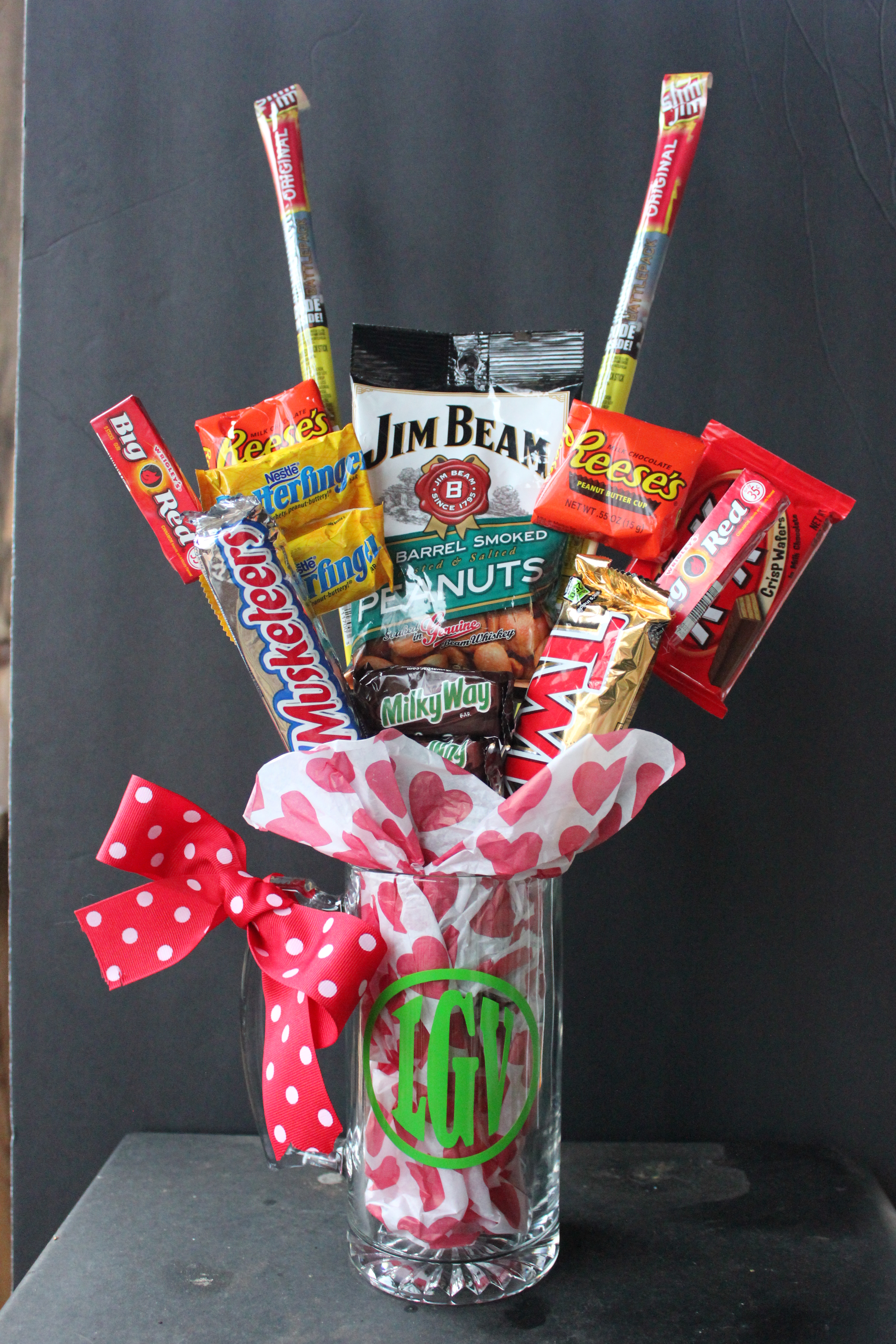 I also made another smaller version too with the left over candies. For this one I also made a monogram out of vinyl and stuck it on a beer mug.