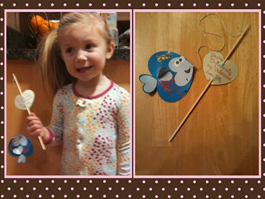 After we ate our cookies we made Valentines. Here is Tilly’s Valentine for her daddy! It says “You are o-fish-ally my Valentine! Love, Tilly!” The fish is made of hearts cut with my Silhouette Machine. Tilly glued it all together and added some glitter (that’s my girl!) and then we strung it to a skewer “fishing. pole” with some glittered twine. He’s going to love it.
