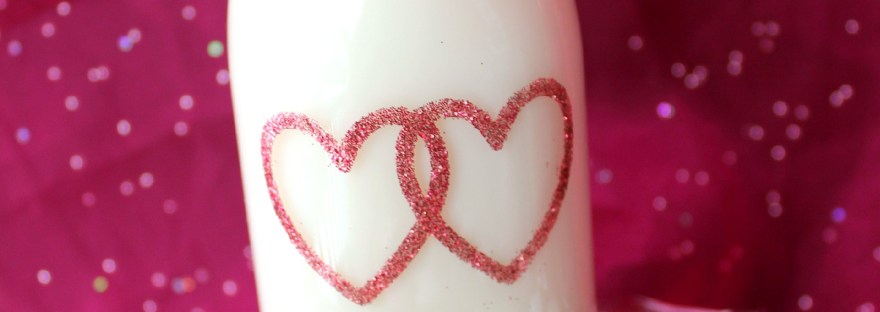 We paired out treats with a glass of milk. I decorated this jar (Starbucks frappe bottle) by cutting out the heart shape out of double-sided adhesive with my Silhouette Cameo and adding glitter. The ribbon and a cute Valentine’s Day straw sets it over the top!