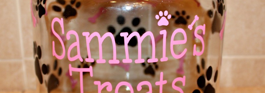 I went to get our dog, Sammie a treat tonight and realized that her treat jar needed a make over. I cut some bone and paw print shapes out with my silhouette cameo and finished it off with a bow. I just love how this turned out! So cute!!